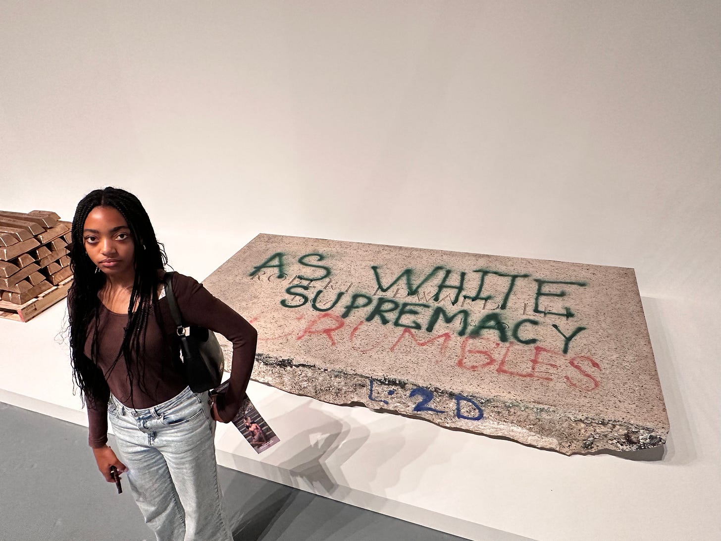 MONUMENTS is a very different show about American history taking place across two exhibition spaces in Los Angeles. At MOCA, decommissioned monuments, many of which honor “Lost Cause” figures, are placed throughout the museum removed from their pedestals and their reverent contexts. Artists were given access to the monuments to melt into ingots, carve into sculptures or incorporate into new works. Some are still pristine, with figures that seem unaware of their missing pedestals, while others are retain paint and graffiti from the protests that preceded their de-installation.