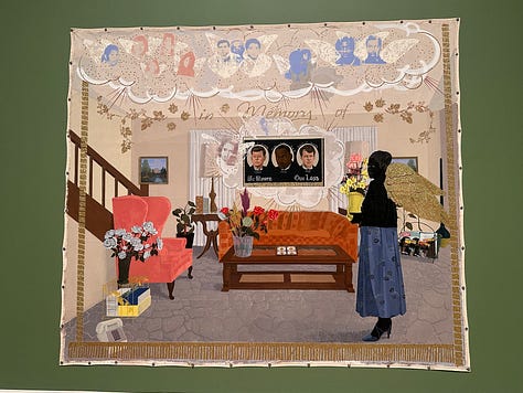 It was phenomenal. The Histories is a massive show taking up eleven galleries with themes that range from epochal periods like the Middle Passage and the Civil Rights Movement to how Blackness is represented (or not) in the western Art Canon, to an intimate scene of a couple lying in bed (rendered all in black), to beautifully rendered scenes within a Black barbershop or a Black beauty school. Most of the works are large scale and many are unframed hanging from the wall like in progress studio works. In a space as grand as the Royal Academy, which historically would have been one of the main perpetrators of anti-Blackness or at least Black omission, seeing this show is profound for some, disorienting for others. It was definitely one of those situations where most of the people were older and white (British!), and I prayed no one tried to make conversation with me.